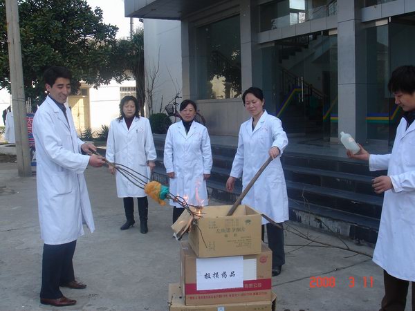 3.15来临之际,我院为切实维护消费者合法权益,对全院所有药品进行了检查,并对近效期药品进行销毁。(图为我院工作人员正在销毁近效期药品)