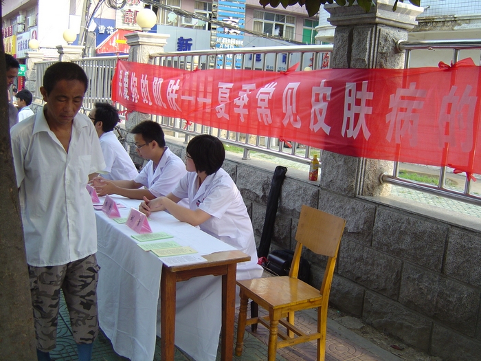 8月14日上午,我院皮肤科组织了“夏季常见皮肤病防治”的义诊活动。今年新入院的3名分别来自湖南、湖北和黑龙江中医药大学皮肤性病学专业的研究生也积极参与其中,用所学的专业知识服务群众。 炎炎夏日是各种皮肤病的高发期,皮肤科针对夏季常见的几种皮肤病如湿疹、 真菌性皮肤病(以手足癣、花斑癣及体股癣为主)、昆虫性皮肤病(以虫咬性皮炎为主)、物理性皮肤病(以痱子、日光性皮炎、夏季性皮炎为主)在治疗和生活预防方面做了介绍。