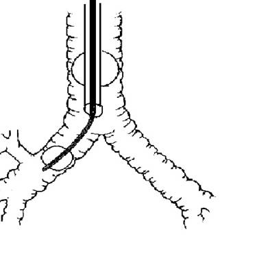 第二步:通过单腔导管管腔缓慢插入支气管封堵器,尾端朝下,方向同样对准需隔离侧主支气管方向。直至明显“突破感”(尾端滑过气管隆突的感觉),套囊即进入主支气管。套囊充气,听诊器听诊双肺隔离完善,完成操作。