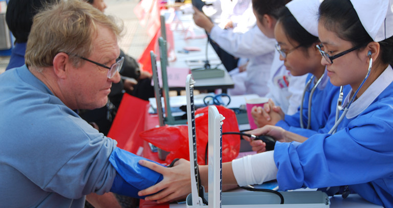 早上7点,我院的义诊宣传台刚准备好,就吸引了往来晨练和买菜的老年人。我院的参诊护士细致的为老年朋友们解开外套的衣袖,仔细的帮他们测量血压,当发现有老年人血压异常,同行的医生会询问他们吃什么药,了解他们的身体情况并交待注意事项。同时我们也散发了自制的老年人健康宣传单,有老年人需要到医院就诊的,医生会为其指明相关的科室并赠予我院新大楼的楼层分布示意图以方便老年朋友们前去就诊。活动期间还有个小插曲,一位外国朋友路过也来测量血压,护士用英语向他解释他的血压数,高压与低压的标准,当他弄明白自己的血压值正常,这位外国朋友高兴的连声说“谢谢”!