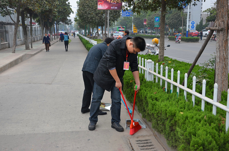 为落实市委、市政府关于创建卫生城市的号召,进一步推进卫生城市创建工作。 10月30日上午,我院组织职工志愿者队伍对我院包保路段进行卫生大清扫活动。在院办王斌主任和李明主任的带领下,我院20余名志愿者队伍分成两批分别对包保路段进行卫生清扫。 我院志愿者队伍在对包保路段清扫的过程中,不放过任何小细节,路面上的纸屑、花坛里的烟头都被大家一一清除。职工志愿者们在自己动手清扫的同时,还不忘对市民进行创卫知识宣传和健康知识教育,并对不良陋习进行批评指正、督促整改。我院志愿者纷纷表示,作为城市的主人,让我们用心倾听创卫战役中每一个动人的音符,因为我们既是创卫的践行者,也是创卫的见证者、受益者。 “创卫”在继续,我院志愿者队伍在行动!