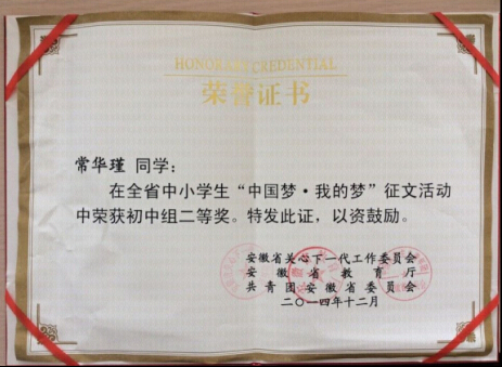 祝贺我院职工子女常华瑾同学在由省关工委、省教育厅、共青团安徽省委员会共同主办的全省中小学生“中国梦●我的梦”征文活动中荣获初中组二等奖。