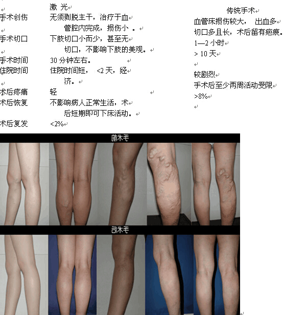 下肢静脉曲张是一种常见病、多发病,患者早期出现下肢静脉隆起、扩张、迂曲成团,经常感觉下肢酸胀、易疲劳,皮肤色素沉着、瘙痒、皮炎,严重者出现局部皮肤感染、糜烂、溃疡,长期不愈合,并可引起静脉血栓形成,严重可导致脑梗塞、心肌梗塞、肺栓塞等严重疾病。 我院外三科引进先进的激光治疗设备,在全市率先开展下肢静脉曲张的微创治疗。该手术应用先进的激光技术和微创血管介入技术,为下肢静脉曲张的治疗开创一次技术革命,真正实现了下肢静脉曲张的微创治疗,填补我市一项技术空白。 治疗范围:大隐静脉曲张、小隐静脉曲张、团状静脉曲张、树枝状静脉曲张、蛛网样静脉曲张等