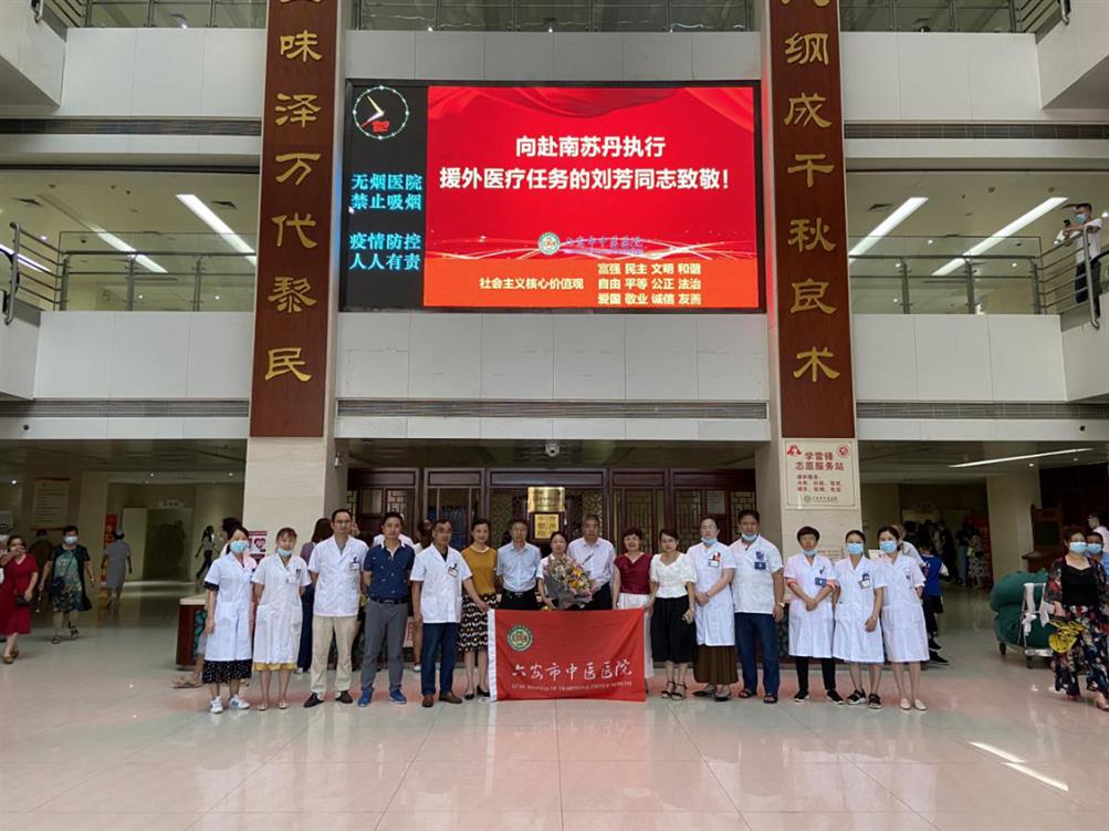 18日早,我院党委书记、院长、副院长、医务科以及皮肤科同志在一楼大厅为刘芳同志送行。刘芳表示,一定不辜负国家、省和医院党委的希望,将与队友们一起尽职尽责、努力工作,以实际行动为南苏丹人民提供优质的医疗服务。
