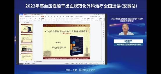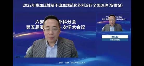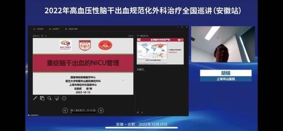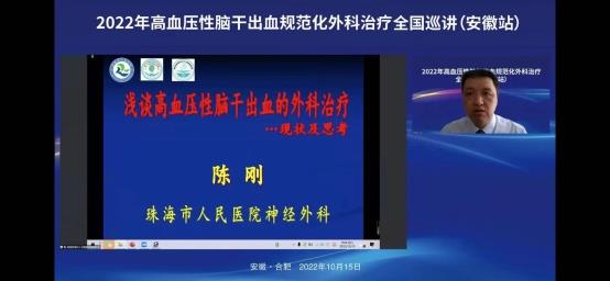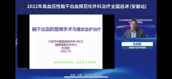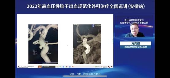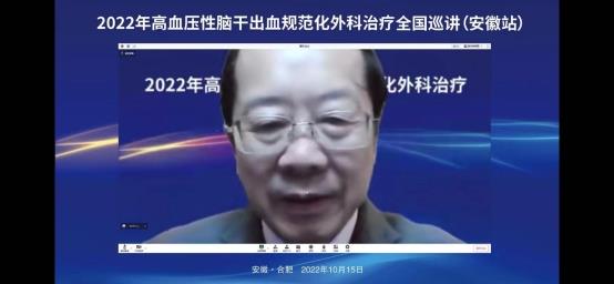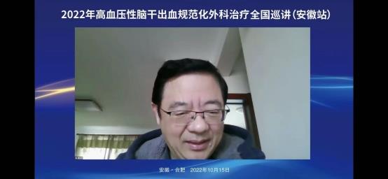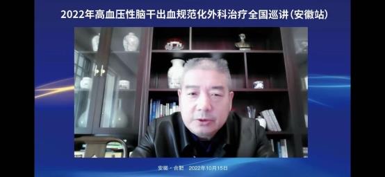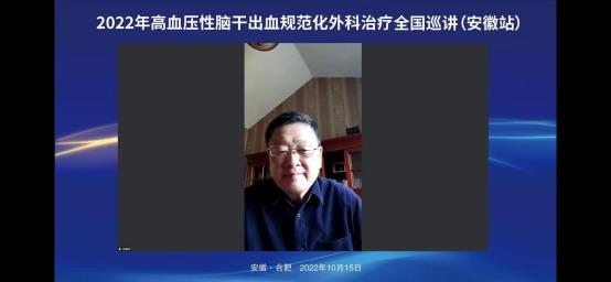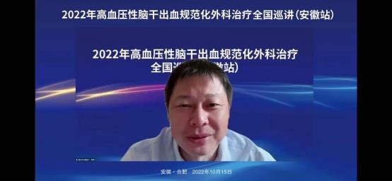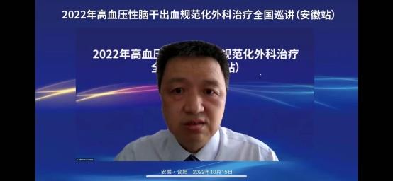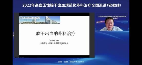 2022年10月15日上午在线上举办了“2022年高血压脑干出血规范化外科治疗全国巡讲(安徽站)”。会议邀请了华西医院游潮教授、上海华山医院胡锦教授、广州中医院大学附院杨进华教授、浙江大学医学院第二附院刘凤强教授、广西医科大学第一附院周全教授、珠海市第一人民医院陈刚教授、安徽大学第一附属医院程宏伟教授、安徽省第二人民医院张永明教授等一大批省内外顶级专家授课。