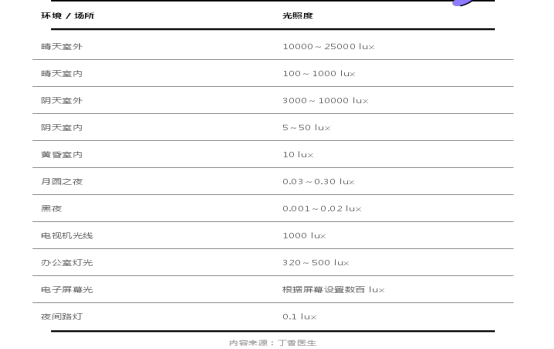 家长可以根据下面这张表判断日常的光照强度:
