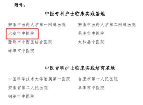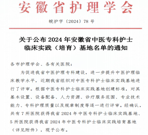 9月10日,安徽省护理学会公布了安徽省中医专科护士临床实践基地名单。经过前期单位申报、专家初选、现场评审等程序,我院凭借扎实的中医护理人才培养工作和学科建设成就,顺利通过现场评审,成功获批为“安徽省中医专科护士临床实践基地”。