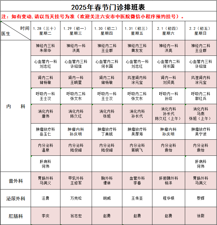 2、初六(2月3日)起:恢复正常周排班,详情请关注六安市中医院微信小程序。