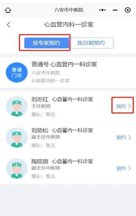 4、选择“按专家预约”或“按日期预约”,选中需要预约的专家、号源、 时段,进行挂号就诊服务。