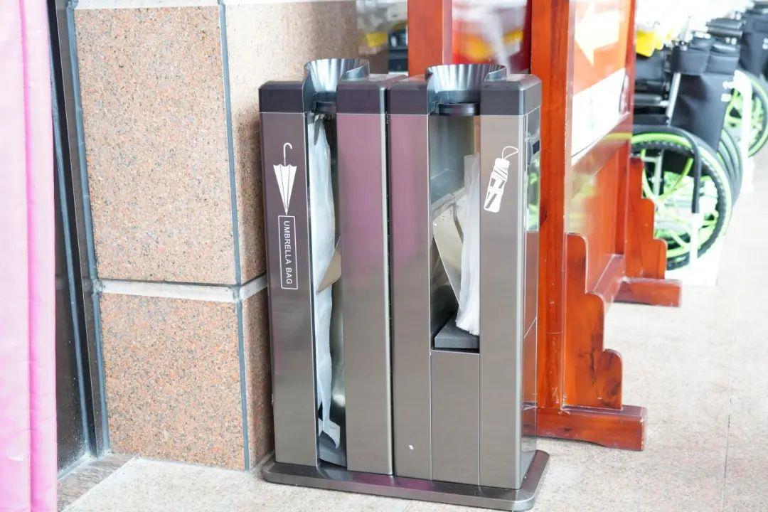 遇到雨天,医院在门诊大厅入口处提供自助伞袋机,就诊患者可将雨伞收纳在伞套内,避免伞上水滴滴落地面造成地面湿滑,时刻为患者及家人的安全着想。