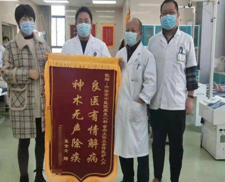 门诊病人张女士长期受到头晕,呕吐和失眠的困扰,在其他医院做过多次检查均未查明原因,期间吃过许多药,但效果均不明显,在朋友的介绍下来到六安市中医院康复二科,经金主任的中医针灸治疗一个疗程后,头晕、呕吐症状消失,失眠症状明显改善。小小锦旗承载着患者对医生医术的认可和医德的肯定,表达着患者对我科医生的信任与感谢,激励着医务人员强医术、修医德,和医患共同努力为健康保驾护航。